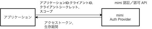 アプリケーションID:クライアントID、クライアントシークレットをクレデンシャルとしてクライアントを mimi の認証プロバイダが認証し、アクセストークンを発行します。